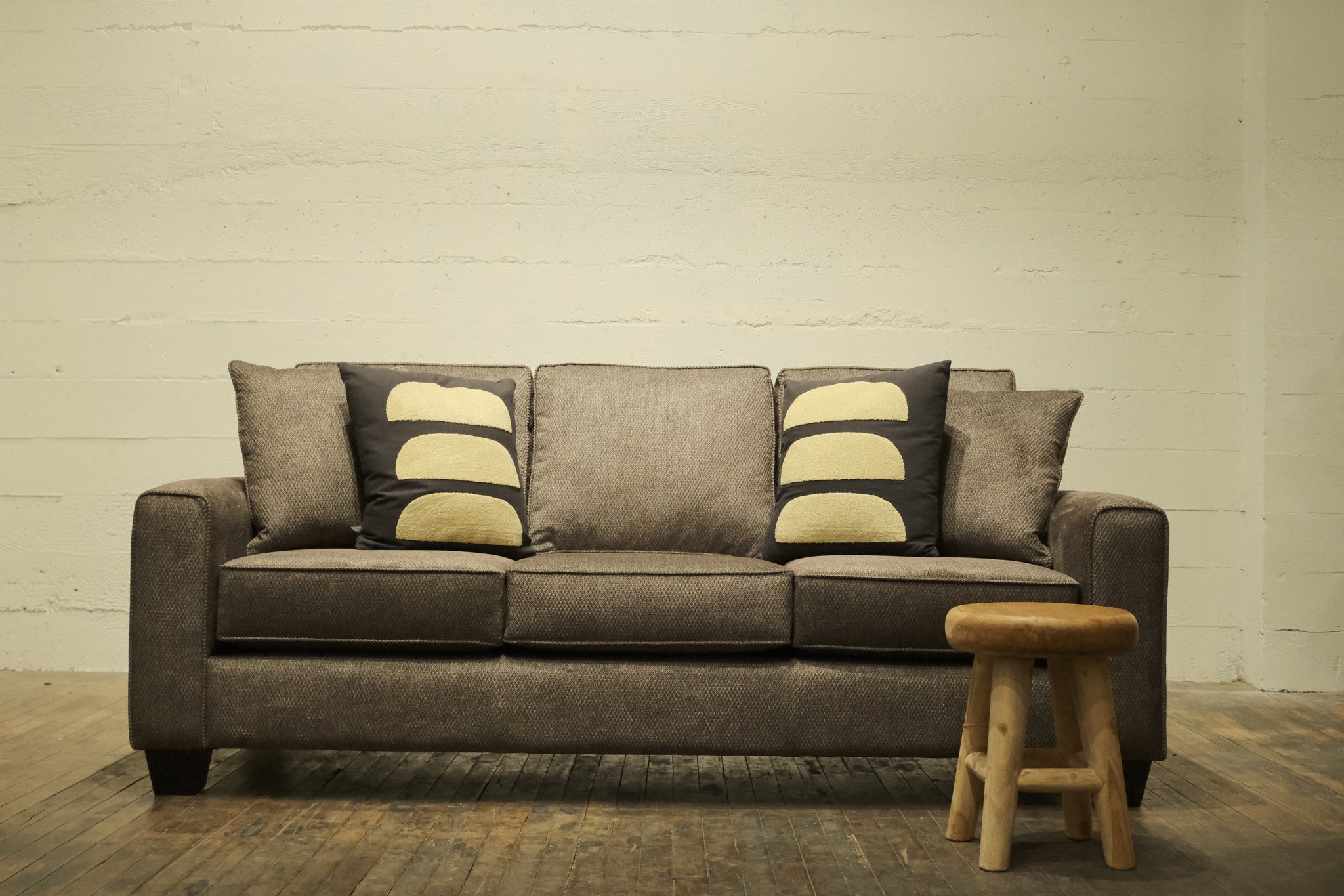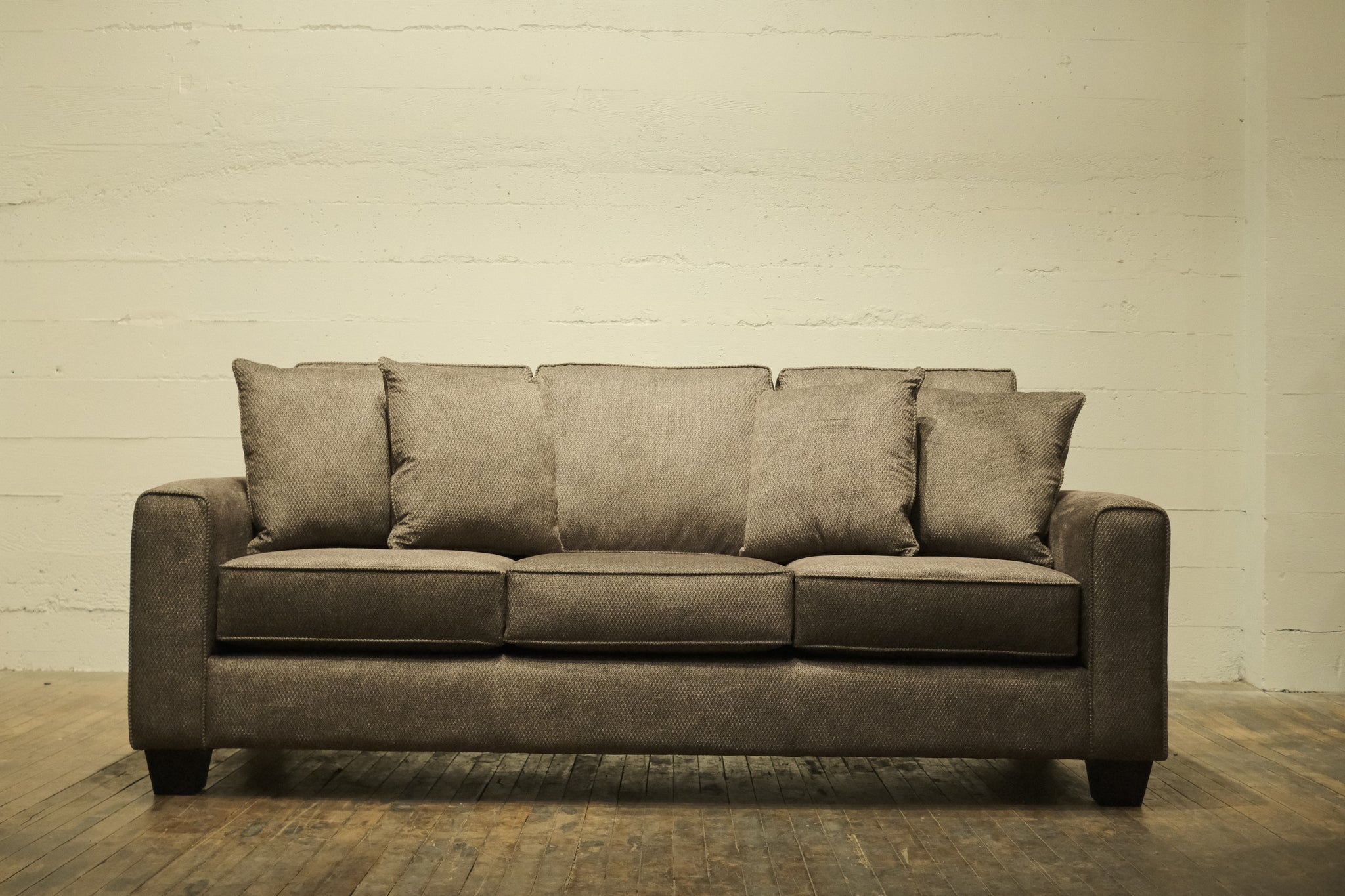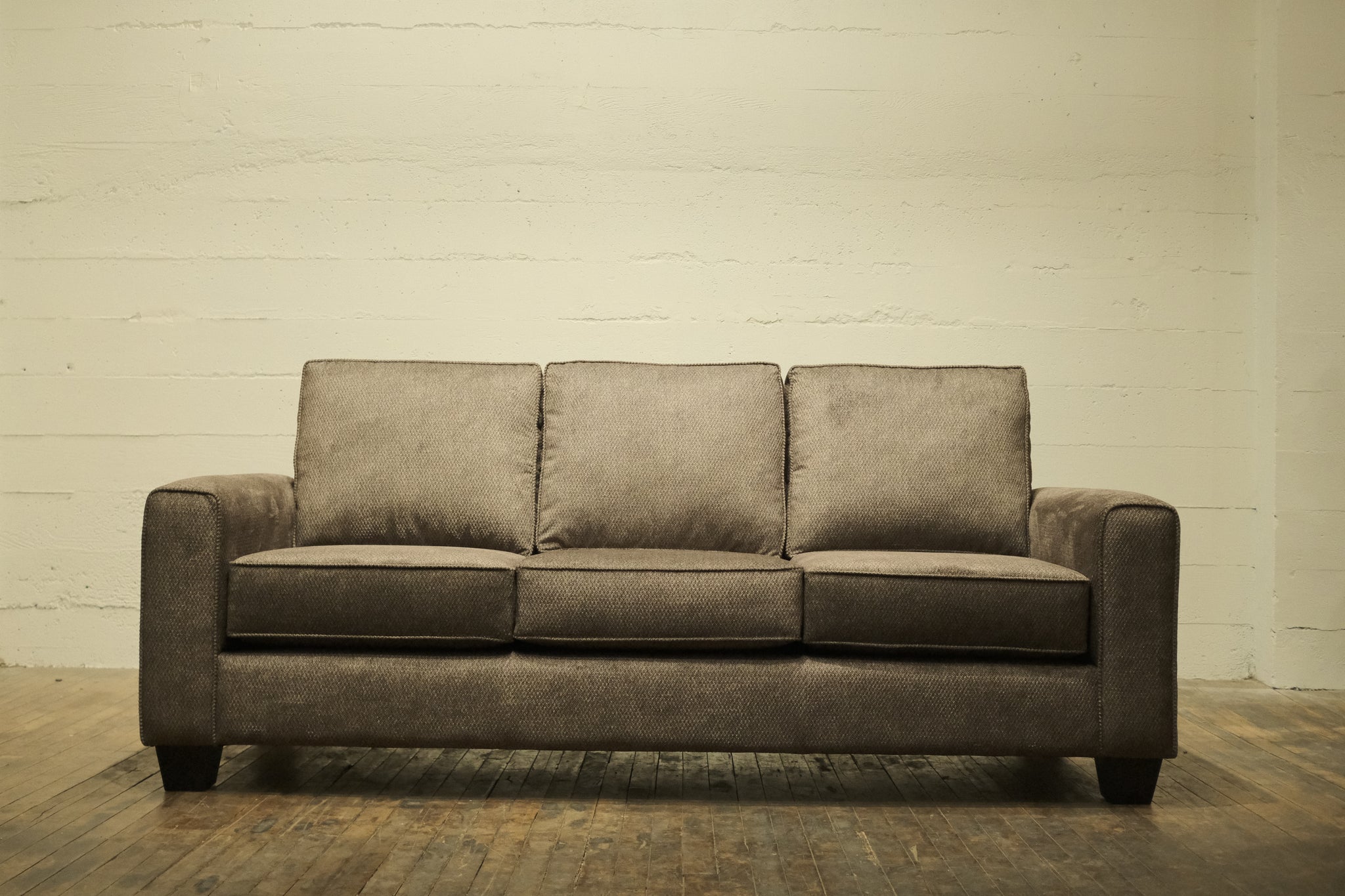 Our Coho Sofa provides a contemporary feel, featuring clean lines with a straightforward, boxy silhouette that gives it a timeless and versatile appeal. The sofa has three seat cushions and three back cushions, all with a slightly overstuffed look for added comfort. The wide, flat armrests provide a relaxed, sturdy feel, while the short, tapered dark wooden legs add a subtle touch of contrast and elevation. The look is simple yet comfortable, making it suitable for a variety of living room styles from modern minimalist to cozy casual.