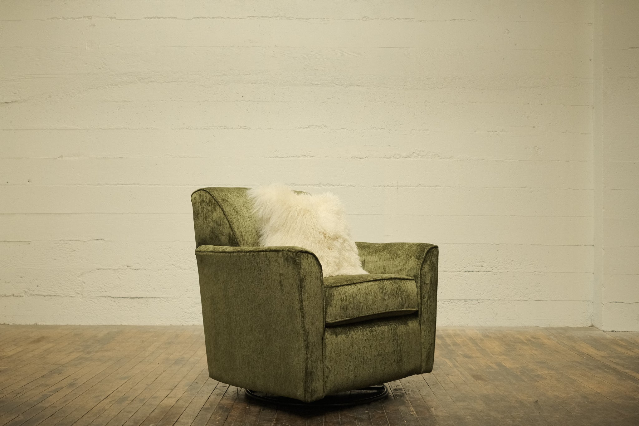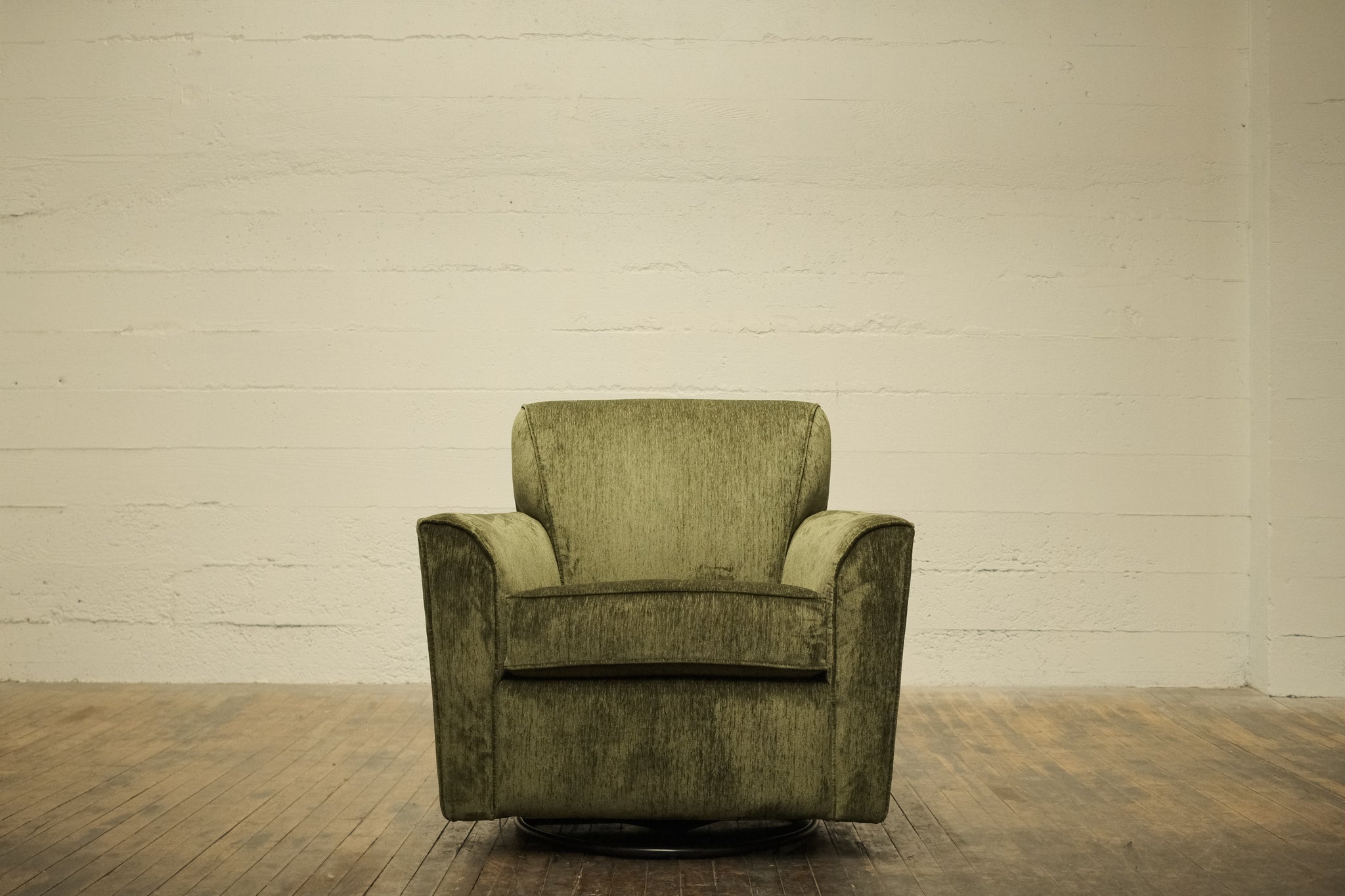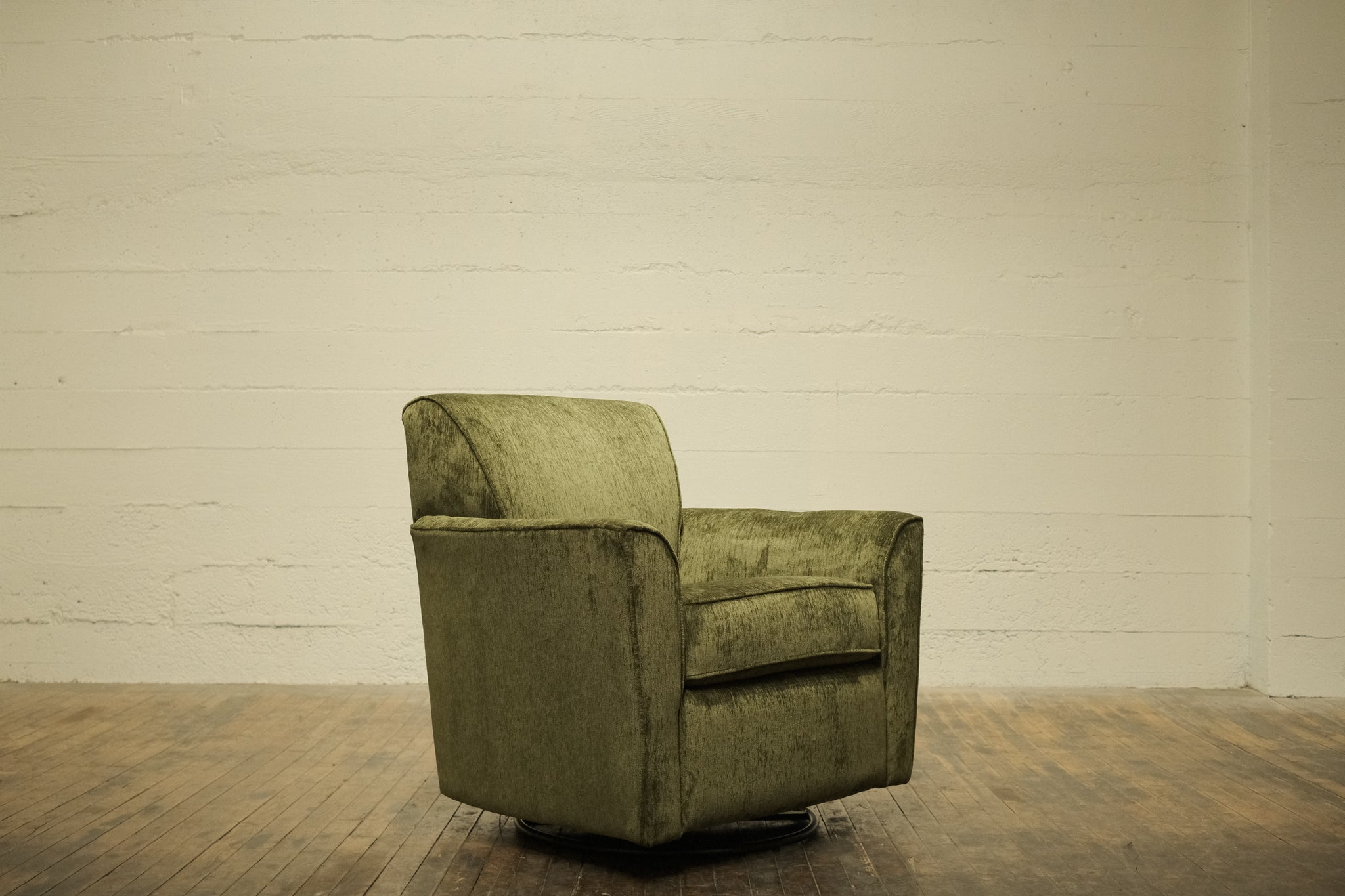 Our Eastside Swivel Chair is a plush, upholstered armchair with a mid-century modern feel. The slightly rounded shape includes broad, curved armrests and a cushioned backrest providing solid support. A swivel base allows for flexibility in placement with a modern yet cozy aesthetic, suitable for contemporary or minimalist interiors.