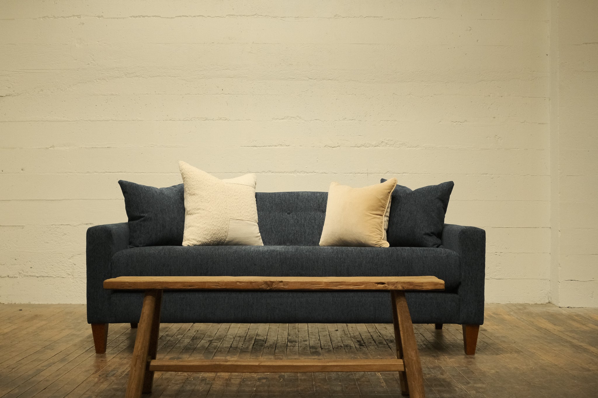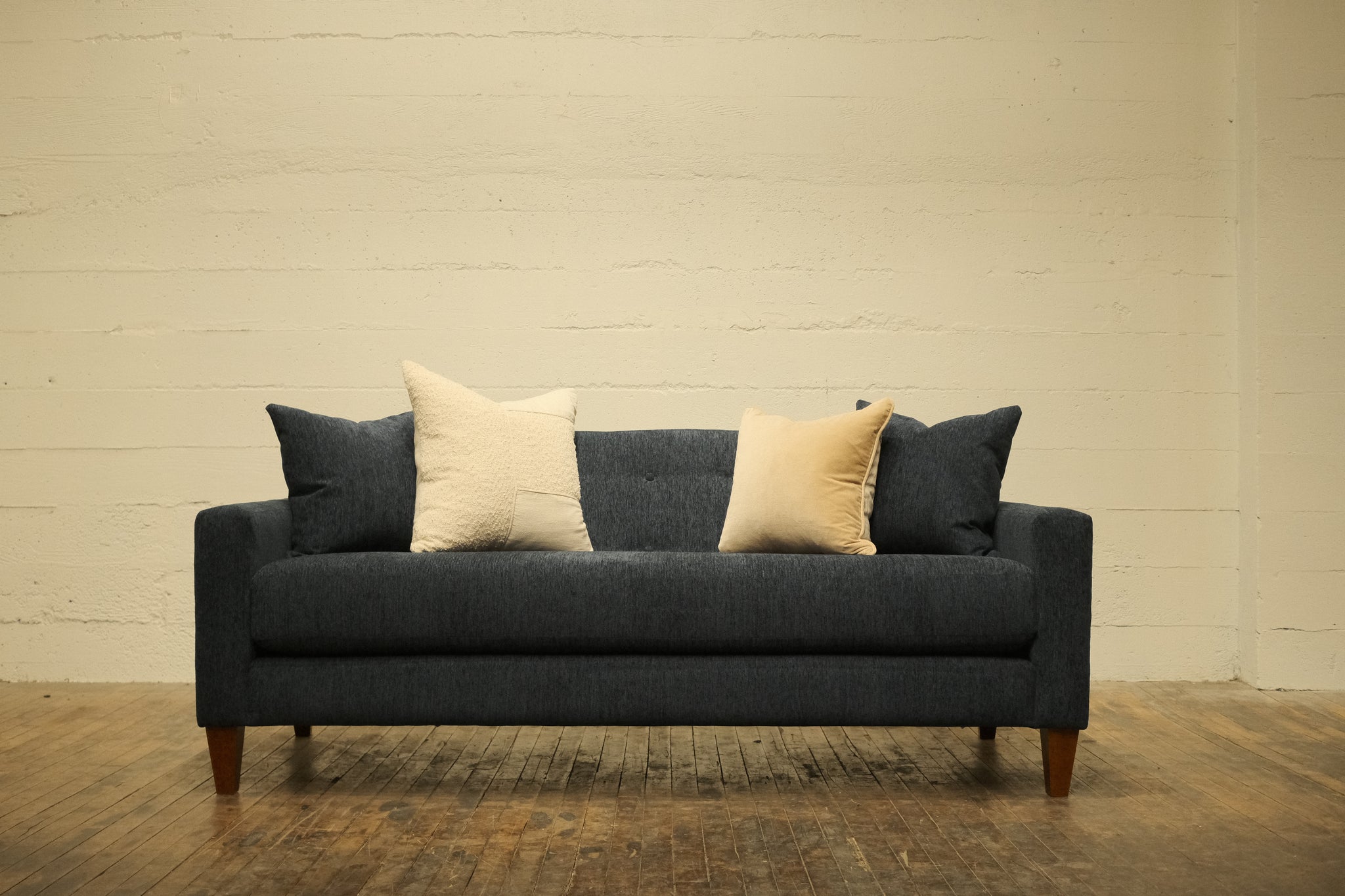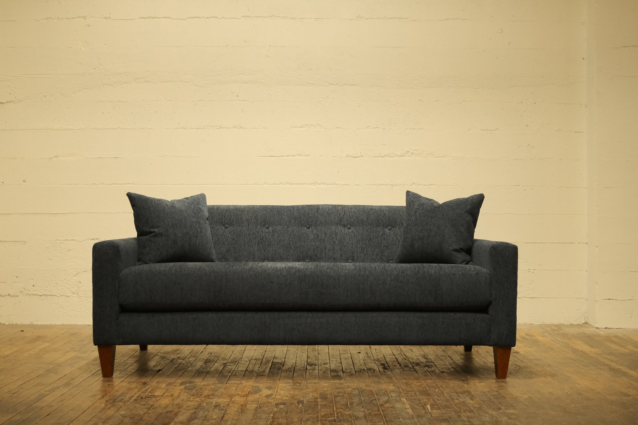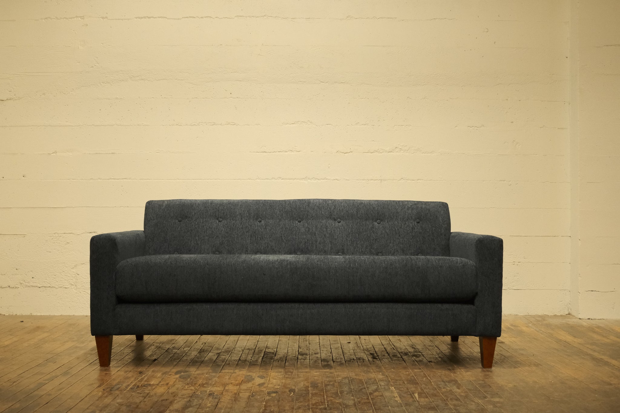 Our Port Lumen Sofa is a sleek, modern piece with a minimalist, mid-century design. It features clean lines and a simple silhouette, with straight armrests and a low profile. The backrest includes subtle button tufting, adding a touch of visual interest and classic sophistication. A one-piece seat cushion creates a smooth, uninterrupted look offering modern minimalism and timeless elegance, suitable for living rooms, offices, or contemporary lounges.