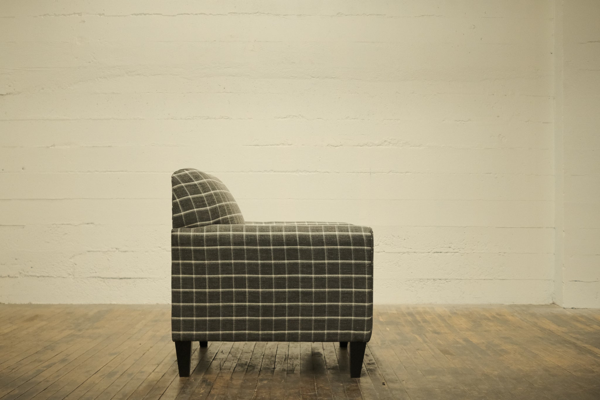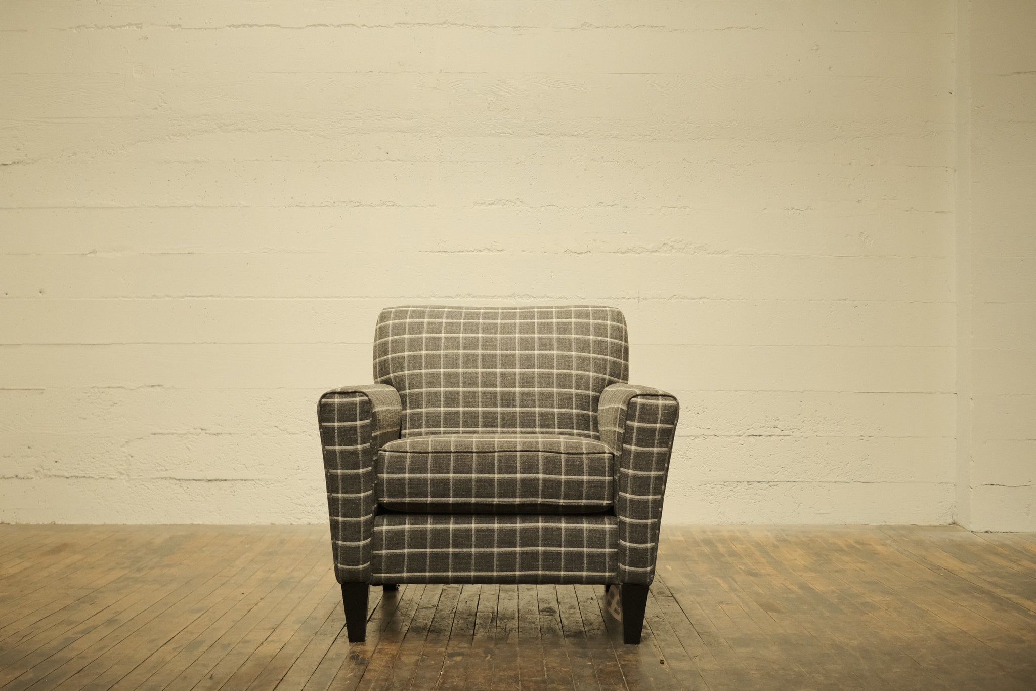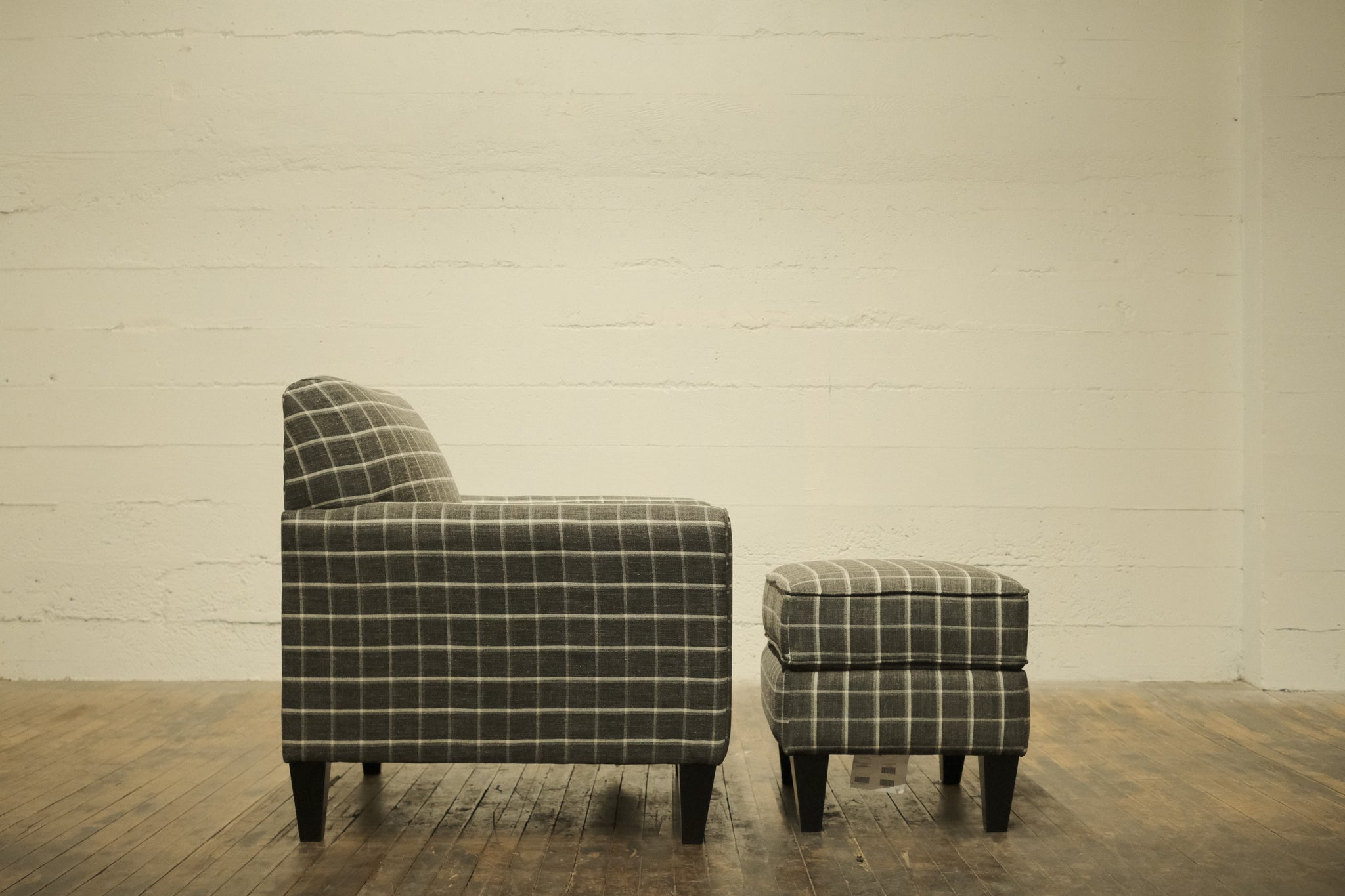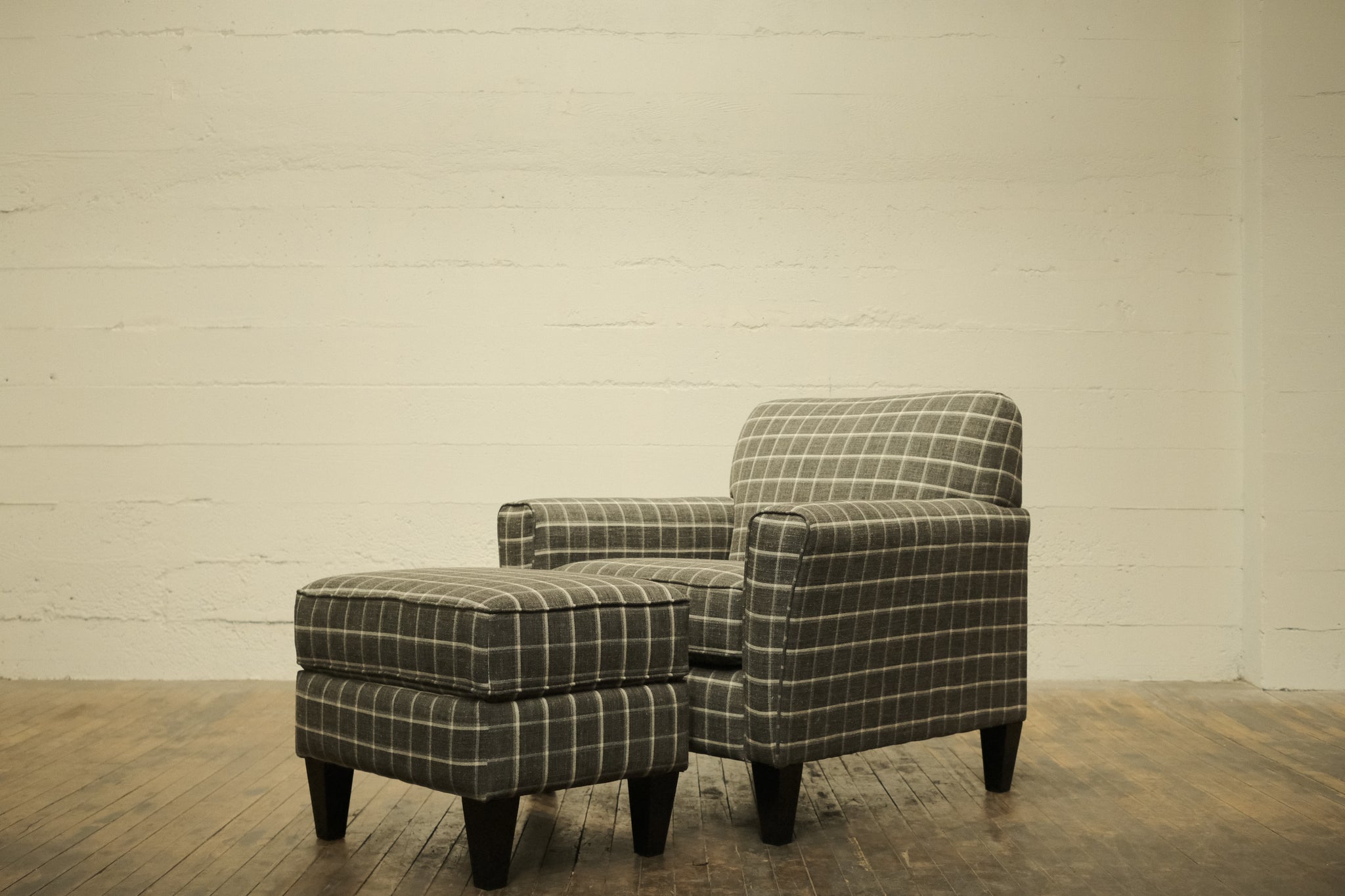 Our Portland Chair is a classic, cozy armchair shown in a gray fabric with a white windowpane plaid pattern, giving it a refined yet inviting look. The lines are clean and tailored, with slightly rounded armrests and a cushioned seat and backrest that are supportive without being bulky. A matching ottoman (footrest) is available sharing the design details, providing a cohesive, comfortable setup ideal for lounging or reading.
