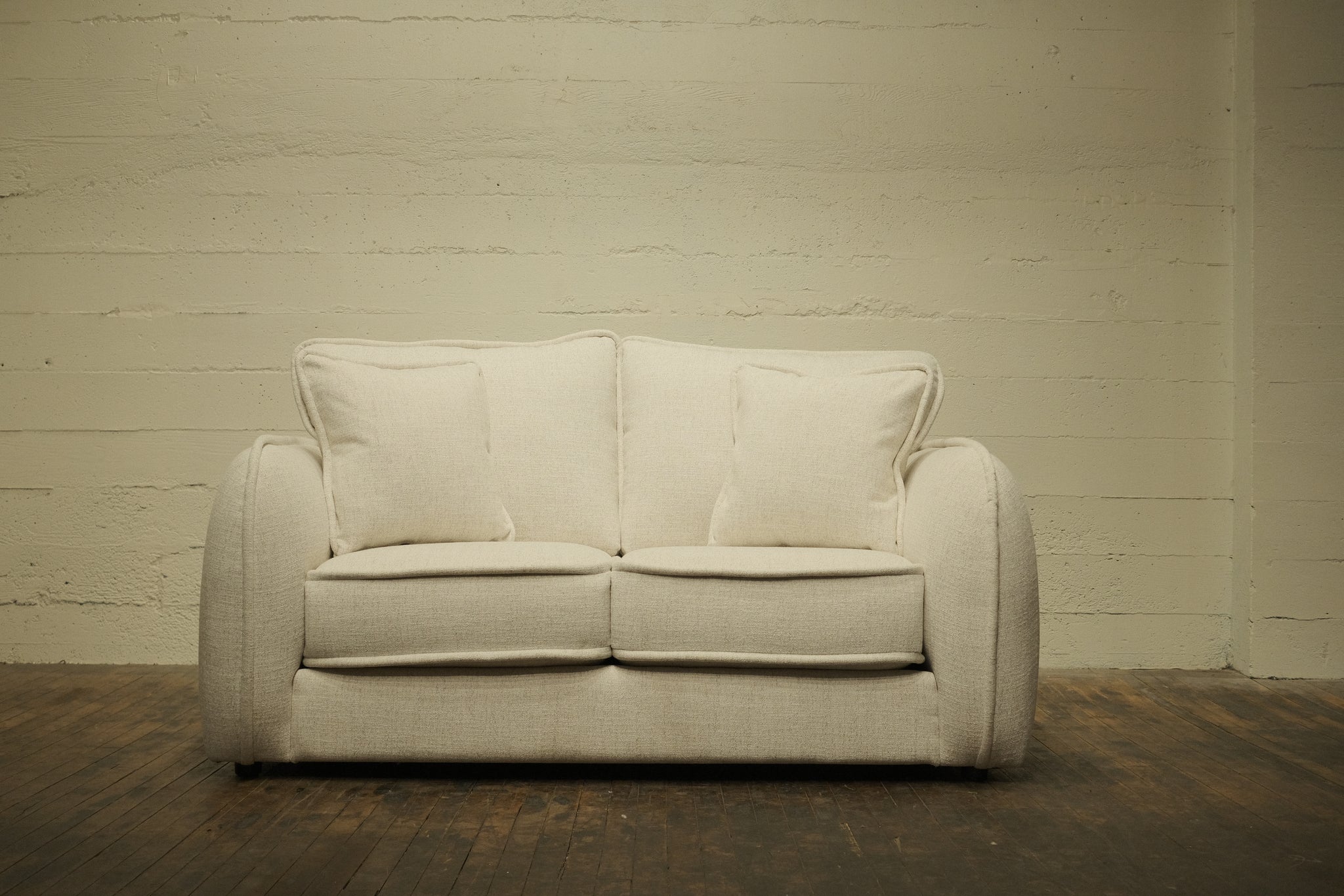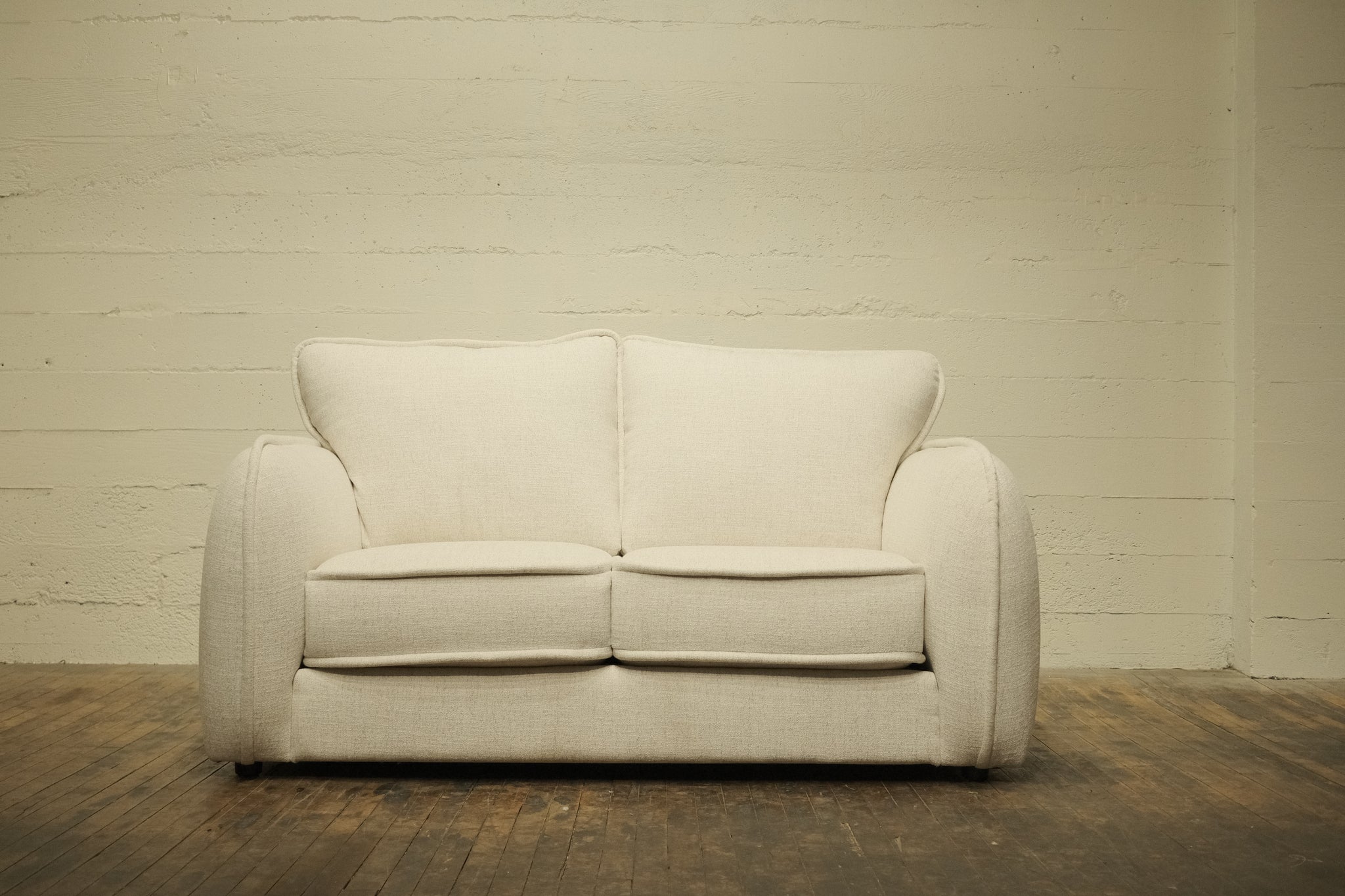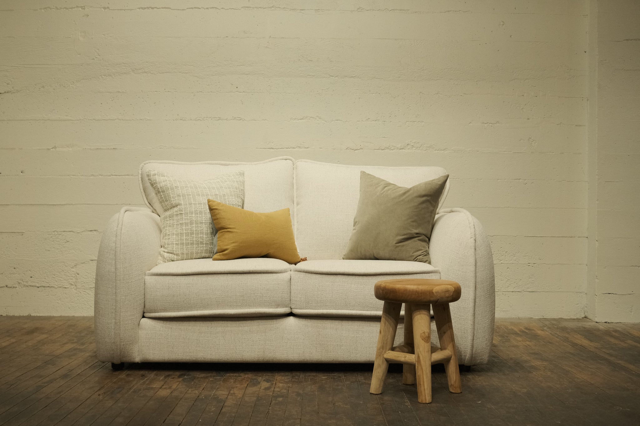 Our Salish Bay Couch is a plush, contemporary two-seater with a soft and inviting design. The couch features rounded, overstuffed armrests that contribute to its comfort-focused, casual aesthetic. Two large seat cushions and two back cushions are complemented by matching throw pillows, all with gentle piped edges that add refinement to the soft contours. The lightly curved silhouette emphasizes comfort and modern simplicity, exuding a relaxed and understated sophistication.