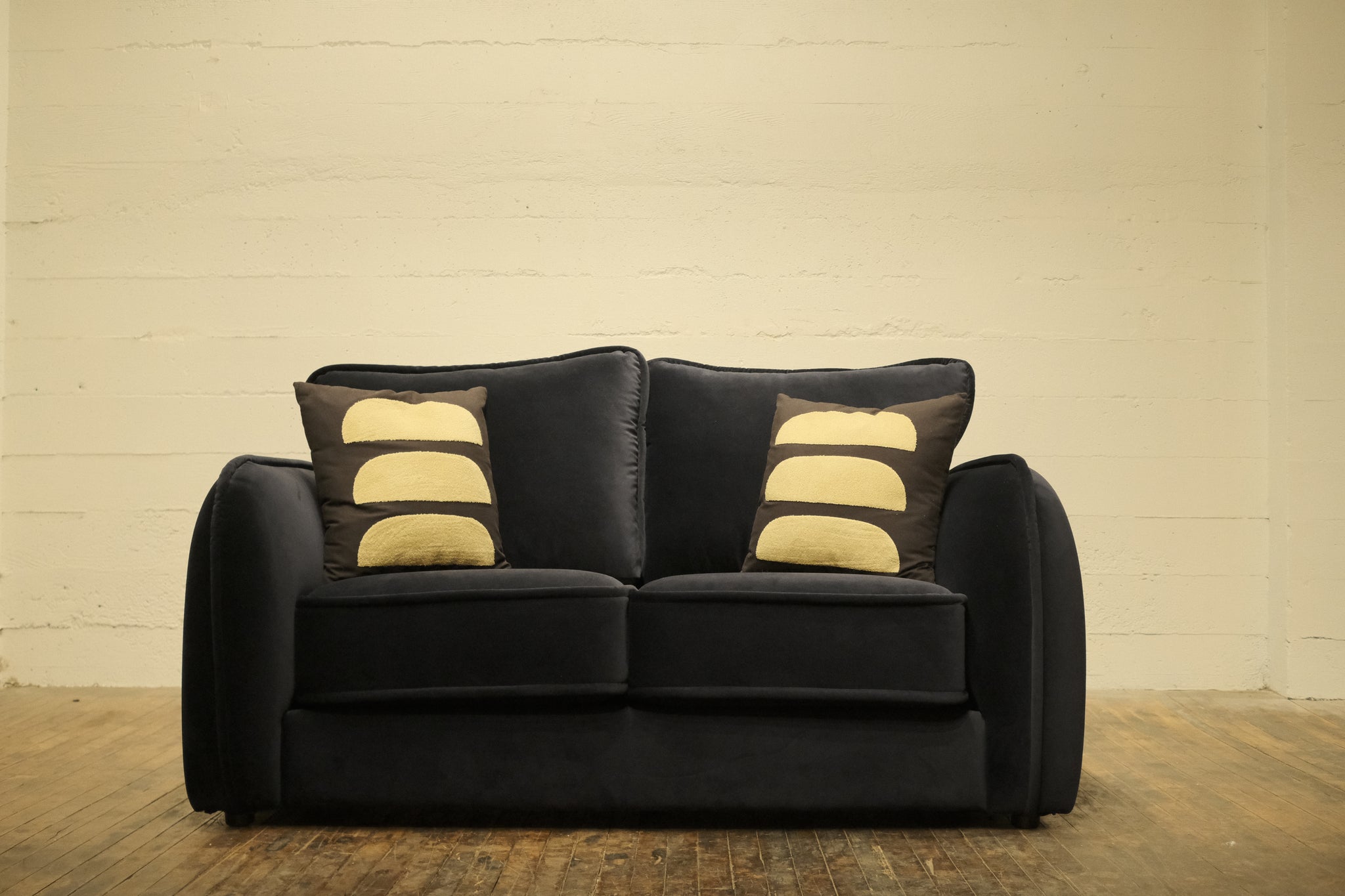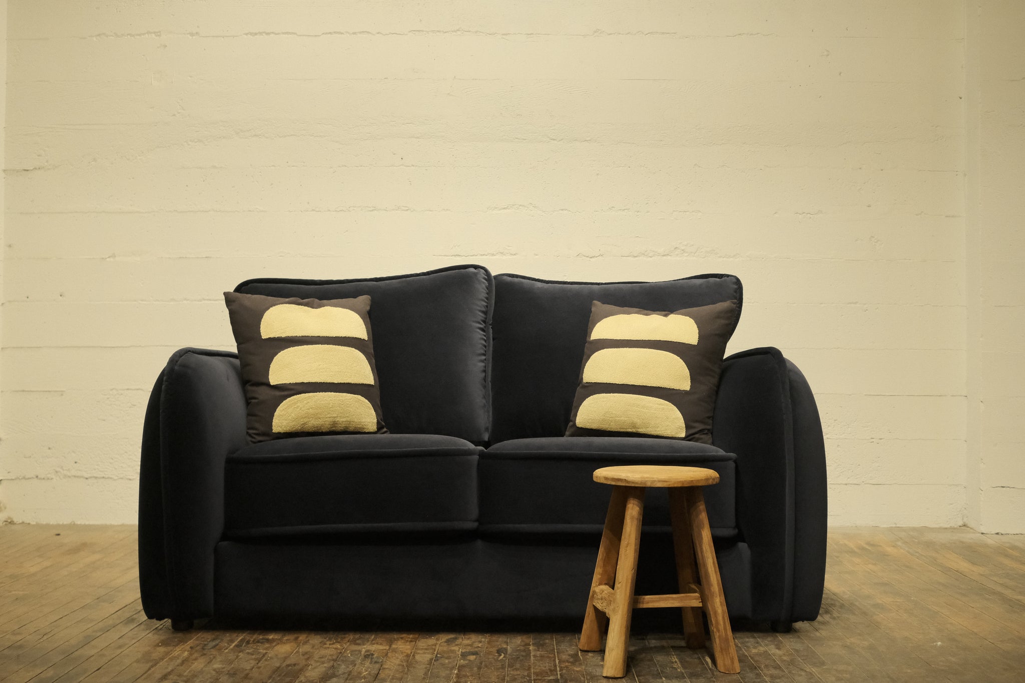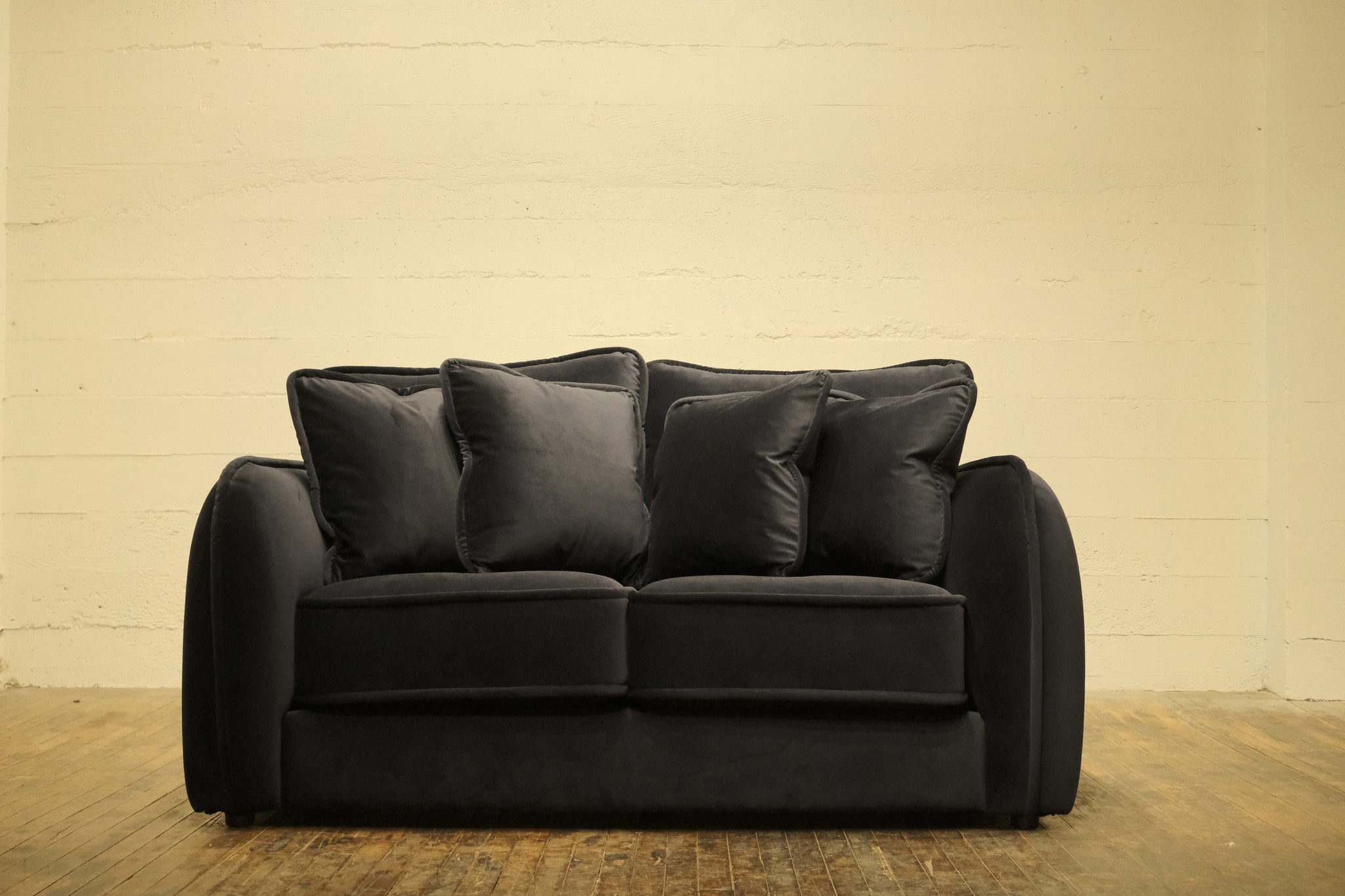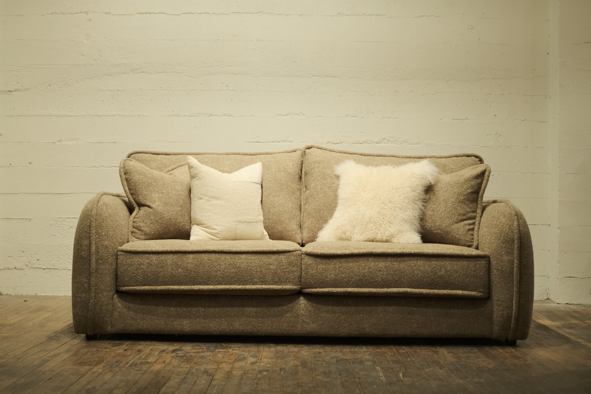 Our Salish Bay Couch is a plush, contemporary two-seater with a soft and inviting design. The couch features rounded, overstuffed armrests that contribute to its comfort-focused, casual aesthetic. Two large seat cushions and two back cushions are complemented by matching throw pillows, all with gentle piped edges that add refinement to the soft contours. The lightly curved silhouette emphasizes comfort and modern simplicity, exuding a relaxed and understated sophistication.